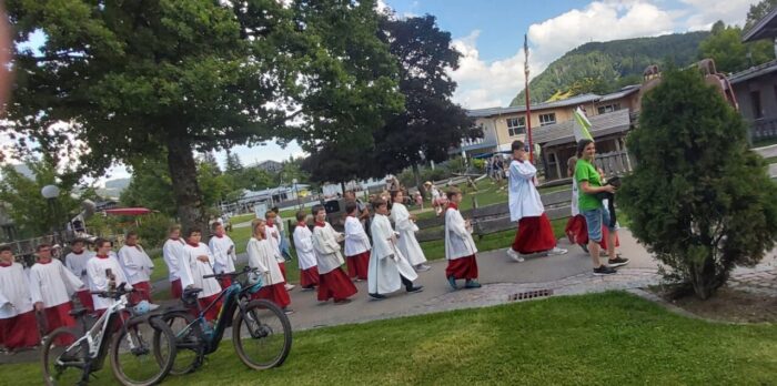 - Beim Festgottesdienst haben wir noch zusätzliche Aufgaben: Wir tragen Kreuz, Kerzenleuchter und Fahnen.